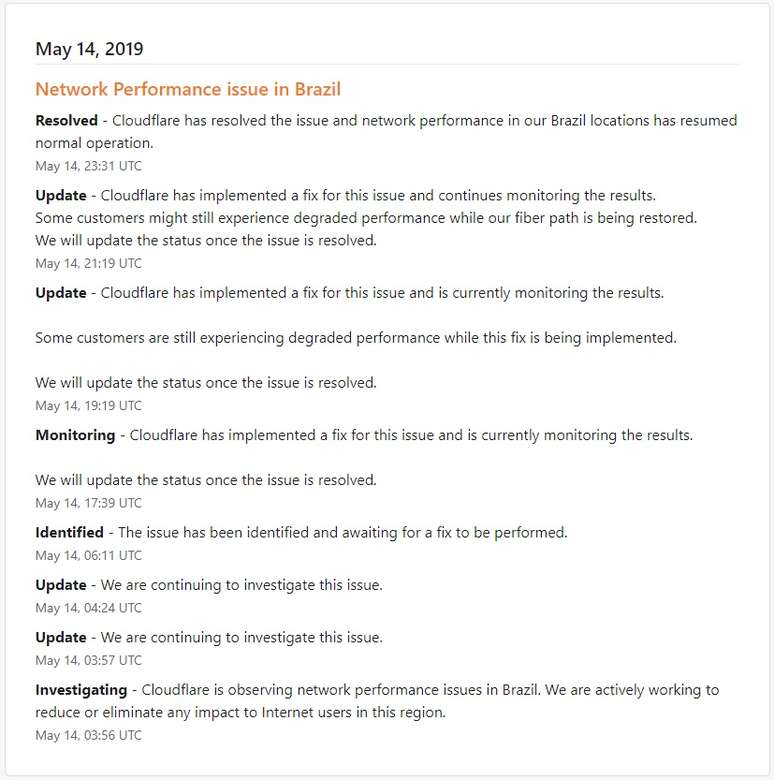 De acordo com o Cloudflare, a instabilidade pode ter nascido nos servidores de Porto Alegre. Por um tempo, os servidores de São Paulo também operaram com "desempenho reduzido". Outros pontos no Brasil funcionaram normalmente durante a última terça-feira (14).