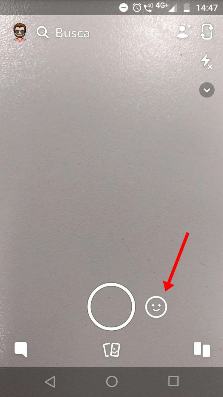 2. Selecione a máscara do filtro cara de bebê, posicione o rosto no dentro do pontilhado indicado na tela e pressione o ícone de câmera para tirar a foto.