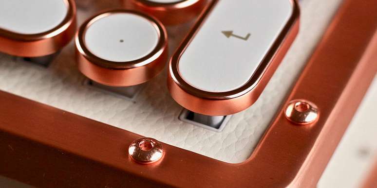 O RCK padrão é um teclado mecânico com bluetooth feito com couro genuíno e um frame de cobre escovado. A bateria dura em torno de nove meses, ou dois, se você ligar algumas luzes de fundo, que iluminam o aparelho — máquinas de escrever antigas não tinham luzes e RGB gamer, mas tudo bem.