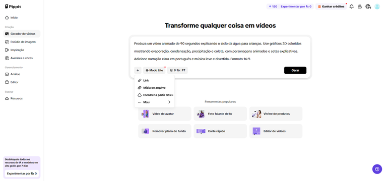 Acesse o Pippit e vá até a área "Gerador de vídeos". Insira um prompt explicando o estilo e o tipo de variações desejadas – cortes rápidos, cortes lentos ou sequências alternativas. Adicione suas referências em "Mídia". Envie arquivos do seu dispositivo, celular, Dropbox ou cole um link. Caso não tenha material disponível, você pode usar os recursos integrados. Quando tudo estiver configurado, clique em "Gerar".