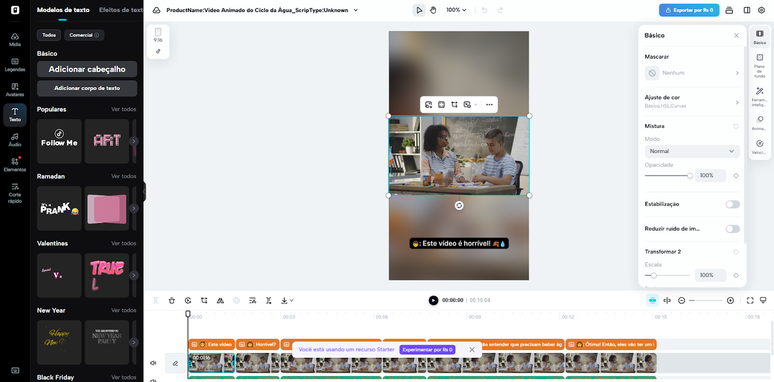 No editor, ajuste legendas, insira novos textos e modifique elementos de design, como tamanho, cor e alinhamento. Aplique filtros, efeitos ou faixas de áudio e remova fundos quando necessário.