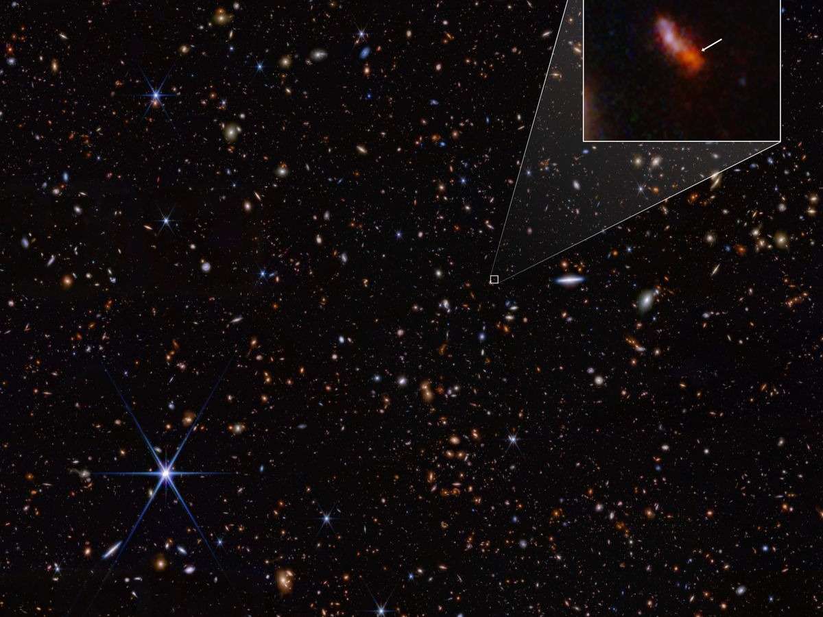 Chamada de JADES-GS-z14-0, estima-se que ela tenha se formado 300 anos após o Big Bang, que ocorreu há 13,8 bilhões de anos