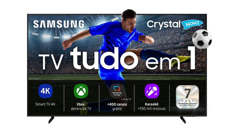Além de entregar qualidade de imagem e som de alto nível, o modelo funciona também como videogame, karaokê e oferece mais de 400 canais gratuitos com o Samsung TV Plus e apps parceiros. A TV Tudo em 1 se destaca por reunir em um único aparelho uma série de recursos que antes exigiriam múltiplos dispositivos ou assinaturas separadas.