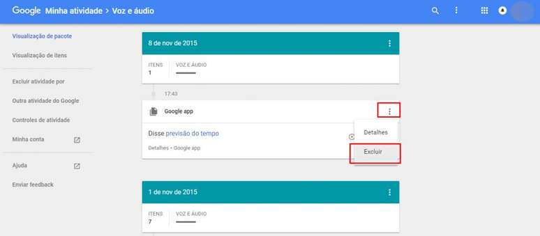 Para deletar, basta clicar no ícone de três pontos ao lado superior direito de cada gravação e clicar em "Excluir".