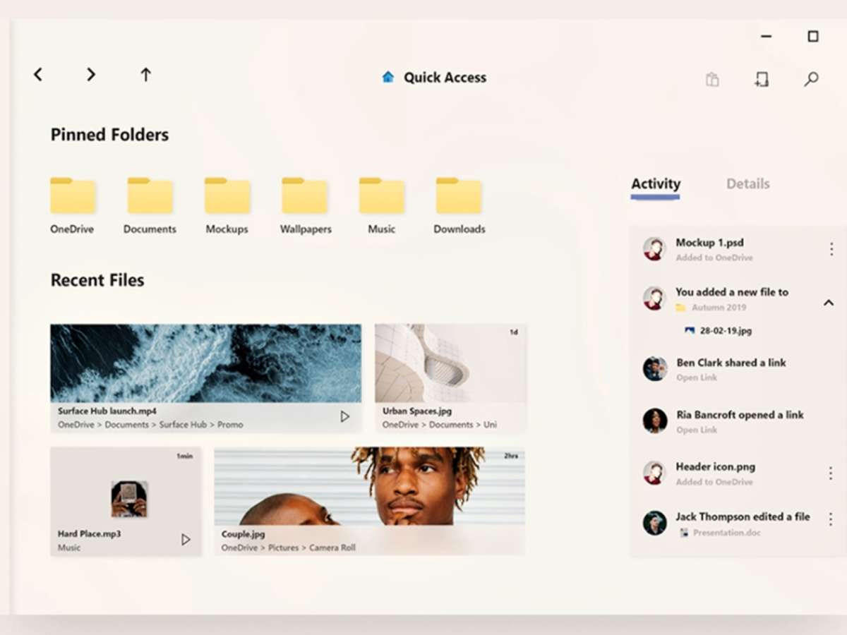No visual abaixo, dá para notar uma certa influência dos gerenciadores de nuvem e dispositivos móveis. Um painel com atalhos fica em uma coluna na esquerda, enquanto os folders ficam na parte superior e os arquivos recentes logo abaixo. No canto direito, um histórico de atividades, que pode ser conectado ao OneDrive, Dropbox, Google Drive e iCloud.