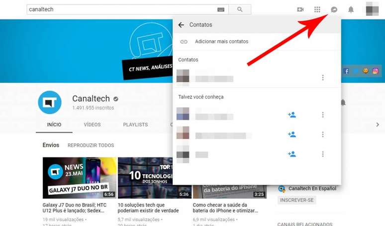 Clicando nesse novo botão, localizado entre as notificações e aplicativos no topo da página da versão web, o usuário vai encontrar mensagens recentes e uma guia "Contatos" com usuários da sua lista do Google, além de sugestões de pessoas para adicionar.