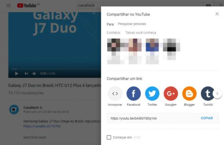 Além da opção de copiar o link ou um código de incorporação, também é possível compartilhar os vídeos pelas contas do YouTube ou ainda por outras redes sociais, como Facebook e Twitter.