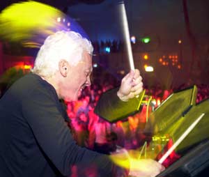 Gramado, 04 de agosto de 2001 - O dono do Ibiza, Julius Rigotto, brinca com a bateria eletrônica e aproveita a festa