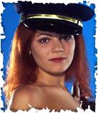 a câmara, segurando um timão, vestindo apenas um quepe de marinheiro.