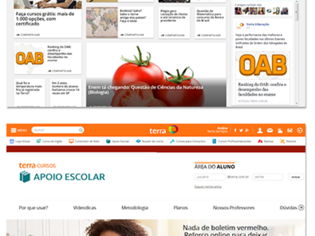 O Terra acaba de reformular seu canal editorial sobre Educação (http://noticias.terra.com.br/educacao/). A principal missão do projeto é trazer conteúdos relevantes e atender a demanda de públicos como estudantes do Ensino Médio, universitários e os interessados em se preparar para prestar concursos. O canal vai oferecer o que o Terra tem de melhor aos estudantes: conteúdo editorial e conteúdo pago, ou seja, um vasto portfólio de serviços e produtos que engloba Terra Apoio Escolar, Terra Concurso Público, Terra Curso de Inglês, Terra Nuvem de Livros, entre outros. "Nos últimos anos estamos investindo fortemente no pilar de Educação, com a oferta de diversos produtos e serviços com grandes nomes no mercado, como Voxy e IOB. O lançamento do canal Educação intensifica nossa cobertura sobre o tema e completa uma demanda na nossa estratégia de negócio", comenta Koiti Inagaki, diretor de Digital Services.