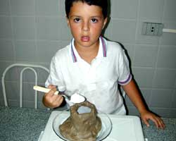 Com o copo dentro do vulcão, coloque uma colher de sopa de fermento.