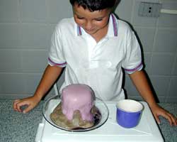 Despeje a mistura que você fez na xícara dentro do copinho (que você já havia colocado o fermento). Pronto! Olha o seu vulcão explodindo!