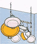 Instale um de madeira/metal no teto e pendure os utensílios com ganchos de açougue. Ajuste as correntes para deixar os utensílios a uma altura acessível.