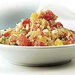 Em uma tigela, coloque a cebola, os tomates, os pimentões, a farinha de mandioca, o azeite, o vinagre e o sal.