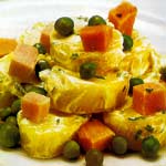 Lave bem as batatas em água corrente. Coloque-as em uma panela, cubra-as com água, leve ao fogo e deixe cozinhar por 25 minutos, ou até as batatas ficarem macias. Retire do fogo, escorra a água, descasque as batatas ainda mornas e corte-as em rodelas não muito finas. Reserve. Coloque em uma tigela o azeite de oliva, a maionese, o suco de limão, as ervas e o sal. Misture e tempere as batatas ainda mornas com esta mistura. Cubra a tigela com o filme plástico e deixe tomar gosto na geladeira por 1 hora. Enquanto isso, escalde as ervilhas por 2 minutos em uma panela com água quente. Retire do fogo, escorra a água, passe por água fria e reserve. No momento de servir, disponha nos pratos as batatas, as ervilhas e o peito de peru em cubos. Acompanhe com 1 copo de suco de maçã pronto.