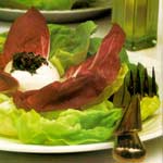 Coloque em uma tigela o azeite de oliva, o majericão, a salsinha, o alecrim, o orégano, as azeitonas, a mostarda, o vinagre, a pimenta e o sal. Misture bem. Com ajuda de um boleador, retire o centro das mussarelas, sem perfurar a parte inferior. Pique a parte retirada e acrescente ao molho de ervas. Recheie as cavidades das mussarelas com a metade do molho, de maneira que fiquem completamente preenchidas. Reserve. Lave as folhas de alface e radicchio e disponha-as em 2 pratos. Coloque 1 mussarela recheada em cada prato e, por último, regue a salada com o restante do molho.