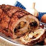 Abra o lombo como um bife grande e reserve. Refogue no azeite a cebola e o alho. Junte os tomates, as uvas passas e as amêndoas. Reduza o fogo e cozinhe por 5 minutos, ou até encorpar. Retire e, assim que esfriar, misture as carnes, o pão, o sal e a pimenta. Misture até ficar homogêneo. Abra o lombo com a camada de gordura voltada para baixo e espalhe o refogado. Enrole-o firmemente e amarre com um barbante. Transfira-o para uma assadeira e reserve. Molho: coloque as pimentas em uma tigela e cubra-as com água quente. Deixe descansar por 30 minutos. A seguir, aqueça o óleo em uma frigideira, junte as amêndoas, as ameixas, 4 dentes de alho amassados e a canela. Cozinhe, sem parar de mexer, por 4 minutos, ou até as amêndoas ficarem amarronzadas. Transfira para o processador, junte o vinagre, as pimentas, a cebola, o tomate e o alho restante amassado. Bata até obter uma pasta. Em uma frigideira, aqueça bem o azeite, junte a pasta e refogue por 5 minutos. Junte o caldo de galinha e retire assim que encorpar um pouco. Pincele o lombo com 5 colheres (sopa) do molho e asse em forno médio, preaquecido, por 2 horas, ou até ficar macio. Durante o cozimento, pincele o lombo algumas vezes com o molho. Retire e sirva com o molho restante.
