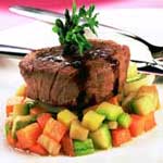 Tempere os medalhões com o sal. Em uma panela, aqueça 4 colheres (sopa) de azeite e frite os medalhões, virando-os com uma espátula, até dourar de modo uniforme. Retire os medalhões e mantenha-os aquecidos. Na mesma panela, coloque o vinho, 4 colheres (sopa) de água, a manjerona e o sal. Cozinhe, mexendo de vez em quando, até o molho reduzir. Retire do fogo e reserve. Aqueça o azeite restante em uma frigideira antiaderente, acrescente os legumes e o sal e salteie até ficarem levemente crocantes. Retire. Disponha os legumes em dois pratos individuais, formando um círculo de cerca de 10 cm de diâmetro. Se preferir, utilize um molde redondo. Coloque o medalhão sobre os legumes, regue com o molho e sirva a seguir. Se preferir, decore com um ramo de manjerona.