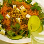 Lave a soja, coloque em uma tigela e cubra com água. Deixe de molho de um dia para o outro. No dia seguinte, escorra a água e transfira a soja para uma panela de pressão. Junte o suco de laranja, 250 ml de água e as folhas de louro. Leve ao fogo e, assim que ferver, tampe a panela e cozinhe por 20 minutos, ou até os grãos ficarem macios. Retire do fogo. Tire a pressão da panela sob a água corrente. Abra a janela, escorra a água e deixe a soja esfriar. Reserve. Em uma saladeira, disponha as folhas de agrião, a soja e a cenoura. Salpique sal e distribua as fatias de limão. Sirva com molho de gengibre com laranja. Coloque em uma tigela 2 colheres (sopa) de gengibre ralado, 1/2 xícara (chá) de suco de laranja, 2 colheres (sopa) de molho de soja light, 2 colheres (sopa) de açúcar e 1/2 xícara (chá) de água. Leve ao fogo e deixe cozinhar, mexendo de vez em quando, por 7 minutos, ou até o volume se reduzir à metade. Retire do fogo, junte 2 colheres (sopa) de salsinha picada e misture. Tampe a panela e deixe repousar por 5 minutos. Sirva a salada com 1 colher (sopa) do molho. Acompanhe com 1 copo de limonada com adoçante.