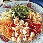 Pique a lagosta e os camarões. Coloque-os em um prato e distribua os demais ingredientes. Molho: misture todos os ingredientes até obter um creme homogêneo. Regue a salada e sirva em seguida.