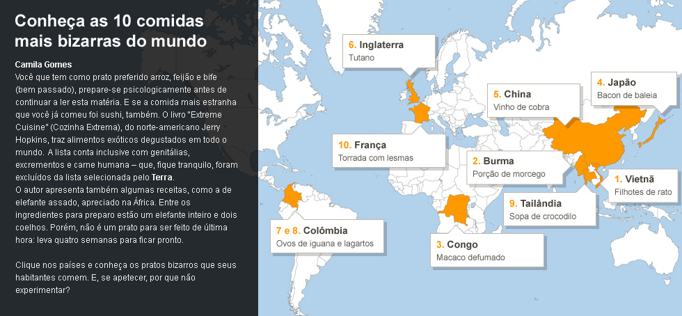 Você que tem como prato preferido arroz, feijão e bife (bem passado), prepare-se psicologicamente antes de continuar a ler esta matéria. E se a comida mais estranha que você já comeu foi sushi, também. O livro “Extreme Cuisine” (Cozinha Extrema), do norte-americano Jerry Hopkins, traz alimentos exóticos degustados em todo o mundo. A lista conta inclusive com genitálias, excrementos e carne humana – que, fique tranquilo, foram excluídos da lista selecionada pelo Terra.