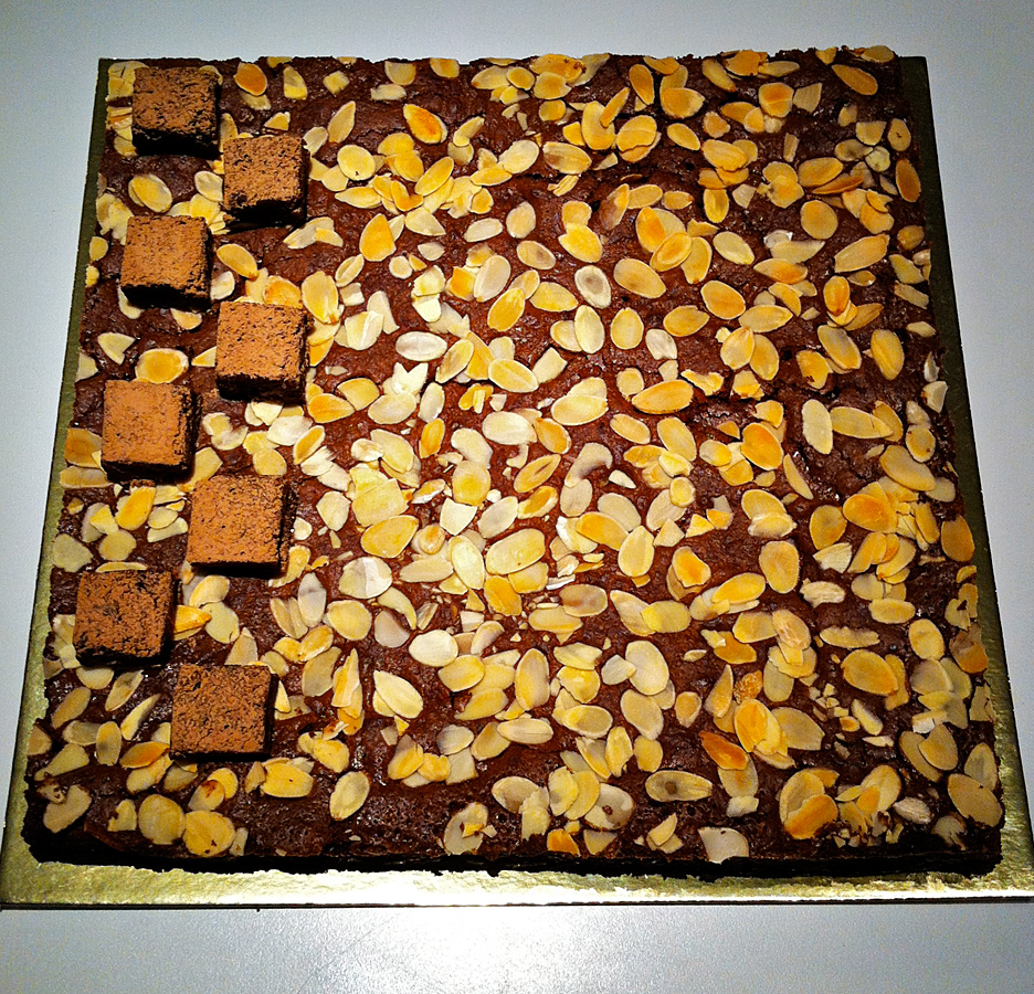 Por fim, adicione a farinha peneirada com chocolate e misture até ficar homogêneo. Coloque a massa pronta na forma. Com ela na forma, despeje as amêndoas picadas e o chocolate de forma homogênea. Com uma colher, cubra esses pedaços para que nenhum fique exposto no forno. Jogue as amêndoas laminadas por cima e leve ao forno por 15 à 20 minutos, até que forme uma crosta fina por cima e ele esteja assado, mas não seco. Tire do forno, e interrompa a cocção colocando-o o freezer ou em cima de uma pedra fria.
