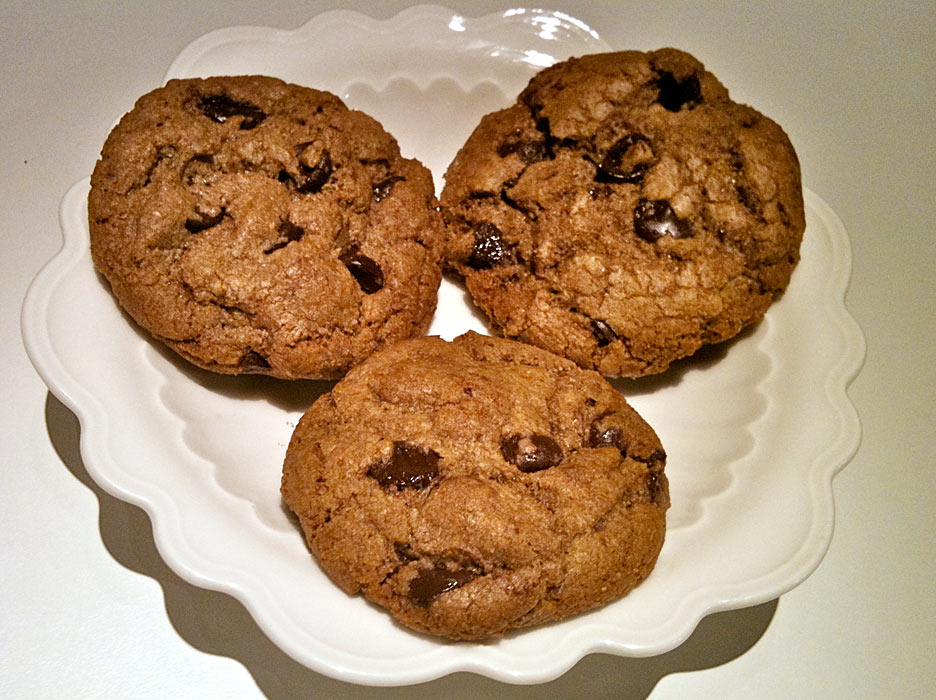 Junte à mistura de manteiga e acrescente as gotas de chocolate. Com uma colher, coloque porções da massa de cookie numa assadeira untada com manteiga e farinha, deixando um espaço de pelo menos dois dedos entre cada cookie. Asse até ficarem levemente dourados no fundo. Tire do forno e enquanto estiverem quentes, retire da assadeira e deixe esfriar em outro lugar.