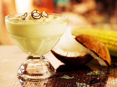 Bata no liquidificador o leite de coco e o sorvete de milho verde até ficar cremoso. Coloque em uma tigela e misture a polpa do coco. Disponha em uma taça pequena e decore com o coco ralado. Sirva em seguida.