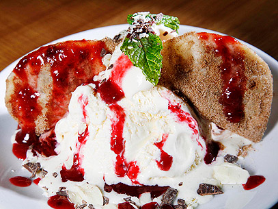 Frite o ravióli em óleo quente até dourar. Passe no açúcar misturado com canela e reserve. Em um prato, coloque uma bola de sorvete de creme, decore com o ravioli, as caldas e as raspas de chocolate.