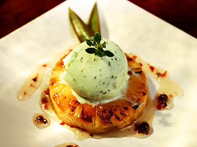 Montagem - Coloque o abacaxi quente no centro do prato e disponha em cima a bola de sorvete e regue com a calda de pimenta fria em volta.