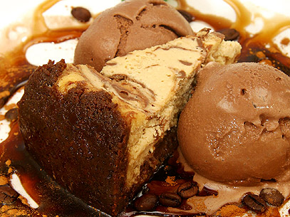 Preaqueça o forno. Unte uma forma e um disco de papel-manteiga. Amasse bem os biscoitos e misture a manteiga a eles e molde na forma. Com a batedeira, bata o cream cheese e o creme de leite até estarem bem misturados. Adicione um ovo de cada vez à farinha, ao açúcar, ao café e ao cardamomo e continue batendo até estar bem misturado. Despeje a mistura sobre a forma com os biscoitos. Com um garfo ou uma colher, misture o chocolate derretido por cima da massa. Ponha para assar por mais ou menos uma hora e dez minutos. Acrescente as duas bolas de sorvete de chocolate.