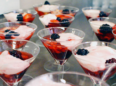 Lave todas as frutas. Corte os morangos ao meio e as maçãs e as amoras em cubinhos pequenos. Em uma tigela, misture todas as frutas e adicione o suco de laranja. Disponha a salada de frutas em taças e adicione uma bola de sorvete de iogurte.