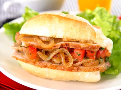 Molho - Misture os ingredientes e leve à geladeira por cerca de 30 minutos. Abra o pão e recheie com fatias de pernil, rodelas de cebola e molho vinagrete.