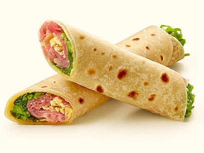 Aqueça a tortilha em uma frigideira até que fique levemente dourada. Passe o molho de mostarda por toda a tortilha e abra as fatias de carpaccio por cima. Faça uma camada fina de queijo parmesão e outra de alface. Enrole como um rocambole e corte ao meio.
