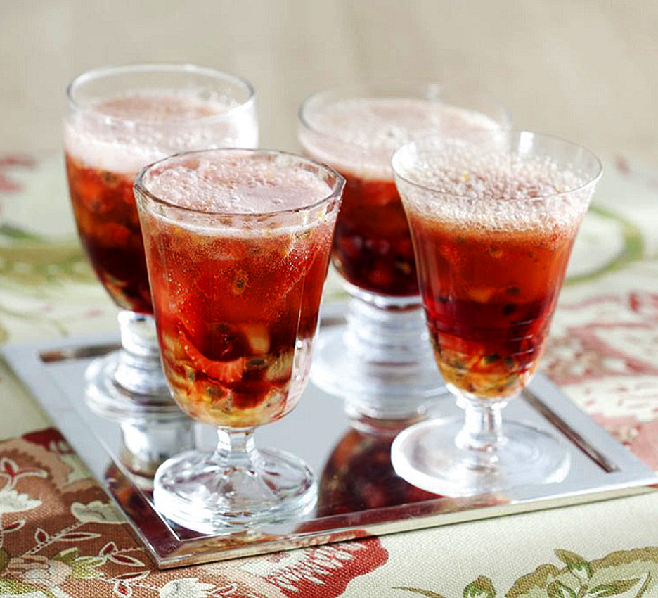 Em um copo, macere as frutas levemente, complete com pedras de gelo e a groselha. Finalize com a água mineral com gás natural e sirva.