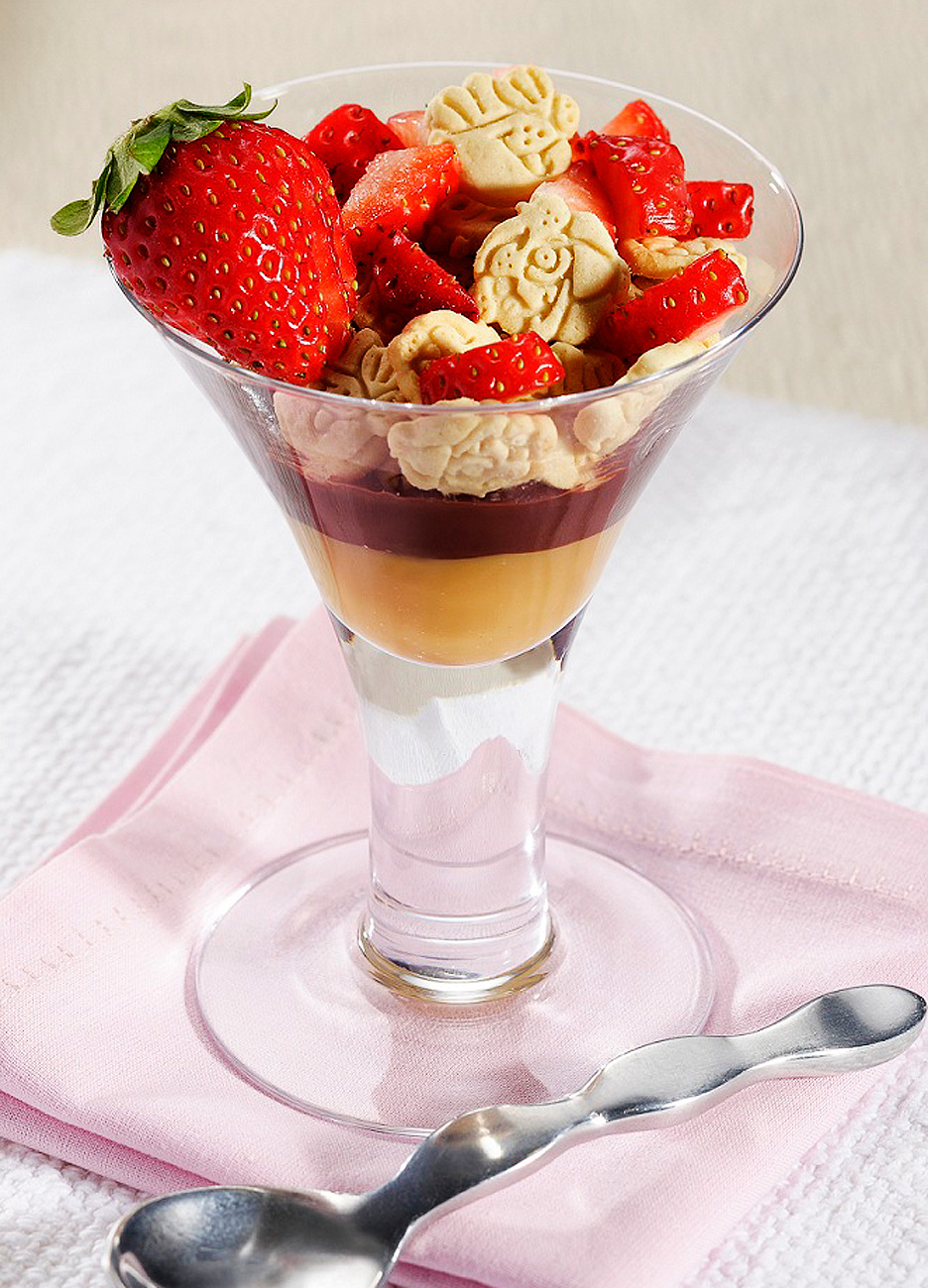 Quebre o chocolate em tabletinhos e coloque em um recipiente refratário. Leve ao micro-ondas por cerca de dois minutos em potência média para derreter. Retire, junte o leite e mexa bem até ficar homogêneo. Reserve. Distribua o doce de leite em taças. Cubra com o chocolate derretido e com os biscoitos. Decore com os morangos. Sirva gelado.