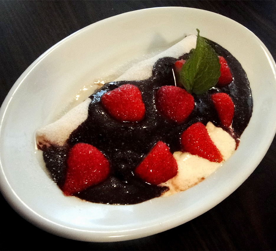 Coloque a massa da tapioca sobre um prato ou travessa, recheie com o creme de nozes, seguido do sorvete, espalhando sobre o creme. Feche a massa como se fosse um pastel. Espalhe a calda de chocolate quente por cima. Decorar com os morangos flambados. E, se quiser, polvilhe um pouco de açúcar de confeiteiro por cima.