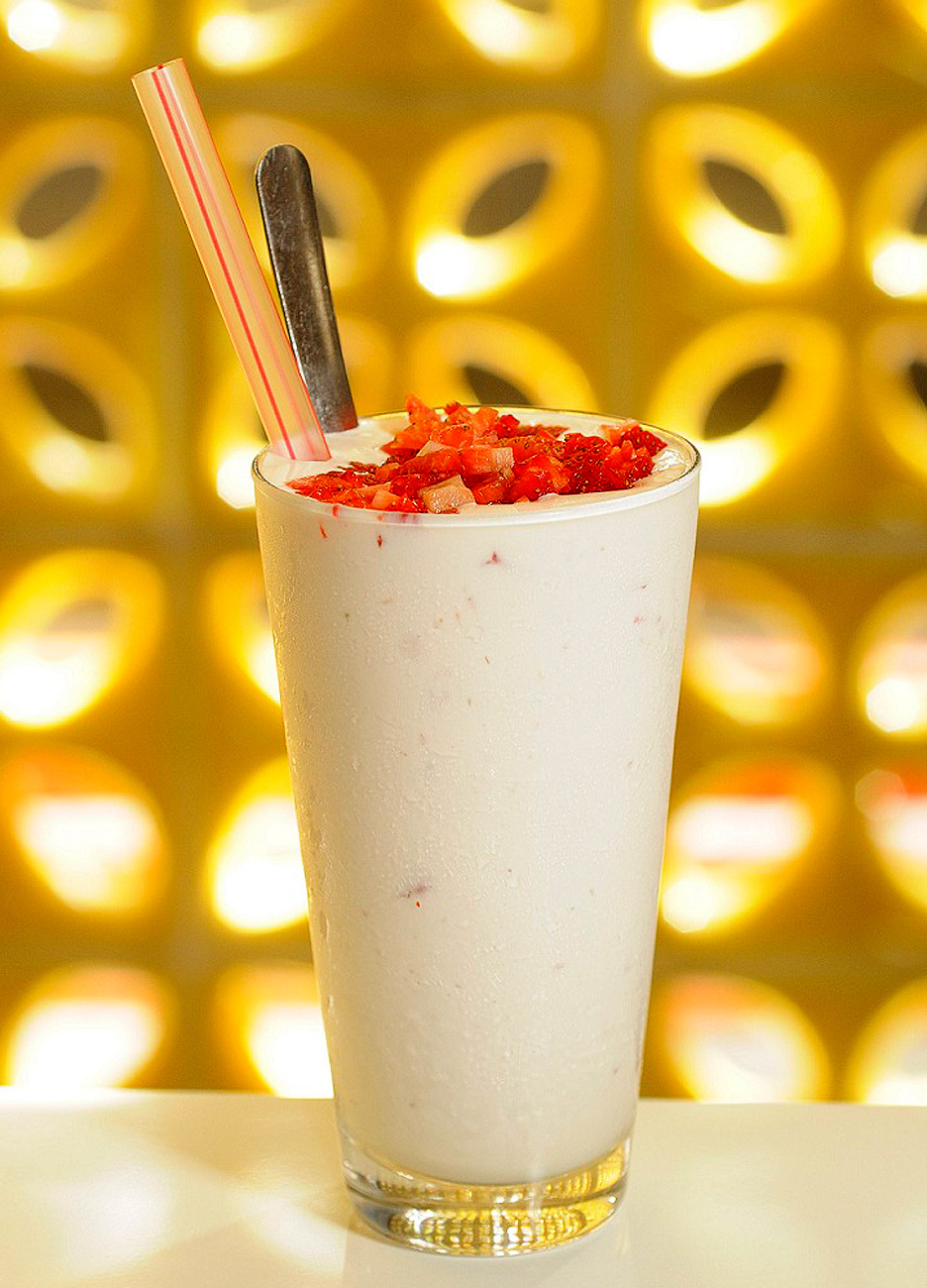 Bata o sorvete com a metade dos morangos e vá acrescentando o leite até atingir a consistência desejada. Decore o copo com a calda de fruta e acrescente a mistura. Por cima, coloque uma pequena quantidade de chantili de forma a fixar o suspiro quebrado e o restante dos morangos picados.