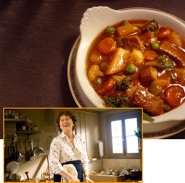 O objetivo da chef Julia é popularizar a comida francesa nos Estados Unidos. Para isso, ela faz inúmeras receitas do país, como o boeuf bourguignon.