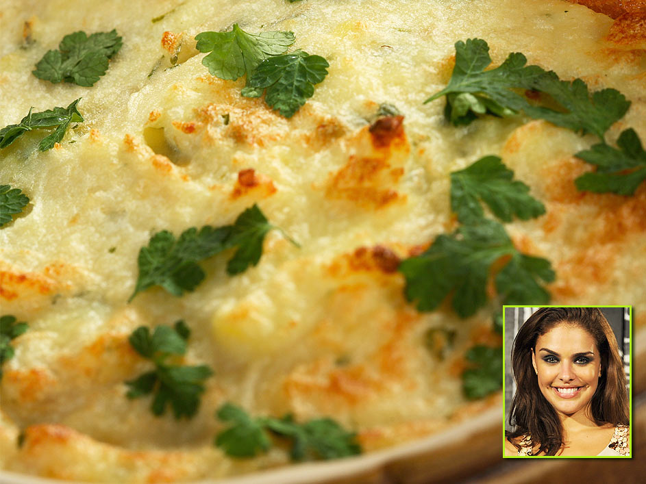 Obs.: As batatas que vão na receita devem ser lavadas e pré-cozidas com casca na panela de pressão por oito minutos. Deixe esfriar, descasque e corte em rodelas finas.