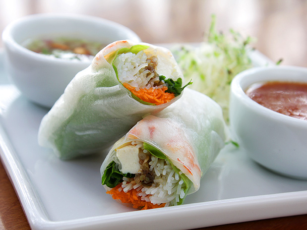 Este rolinho servido como entrada do Fillipa, que tem cozinha contemporânea, é inspirado na culinária vietnamita, feito com folha de arroz e recheado com cenoura, broto de feijão, tofu, camarão, ervas frescas e macarrão, com um molho especial.