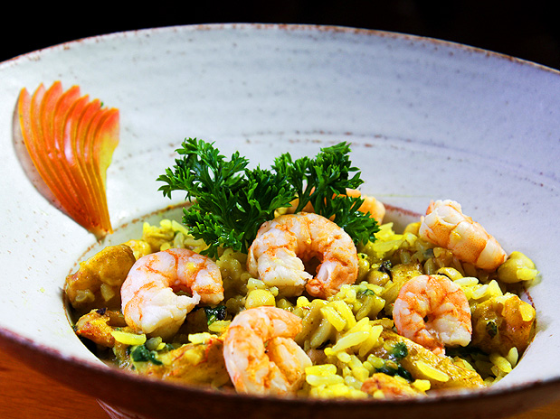 Embora o nome não remeta a nada diferente, esta opção de prato principal do Na Cozinha é regato a leite de coco com coentro, curry, queijo parmesão e suco de manga.