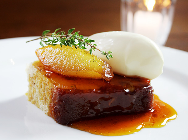 Para o confit de peras, descasque-as e as corte em cubos, coloque junto aos outros ingredientes em uma panela com tampa e cozinhe por dez minutos. Retire a tampa, mexa com uma colher e cozinhe até que todo o líquido tenha evaporado e as peras estejam tenras e com uma cor de caramelo. Deixe esfriar.