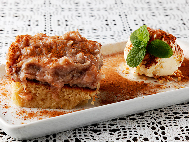 O charmoso Otto Bistrot, especializado em comida contemporânea, oferece esta cuca de banana com sorvete de creme e canela como opção de sobremesa no almoço.