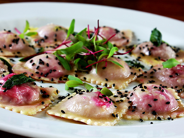 O especializado em comida italiana Vinheria Percussi serve como prato principal no jantar ravióli fresco preparado com beterrabas e recheado com ricota defumada, servida com gergelim negro na manteiga e sálvia.