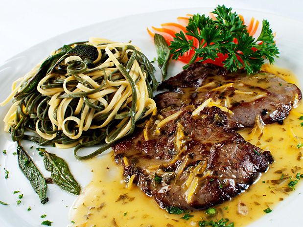 Uma das opções de prato principal no italiano Dell Arte é o escalope de filé mignon ao molho de limão siciliano com tagliolini plaglia e feno na manteiga e sálvia.
