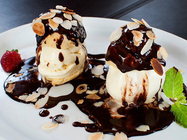 O restaurante francês L’Amitie oferece como opção de jantar os tradicionais profiteroles com sorvete de creme, calda de chocolate e lascas de amêndoas.