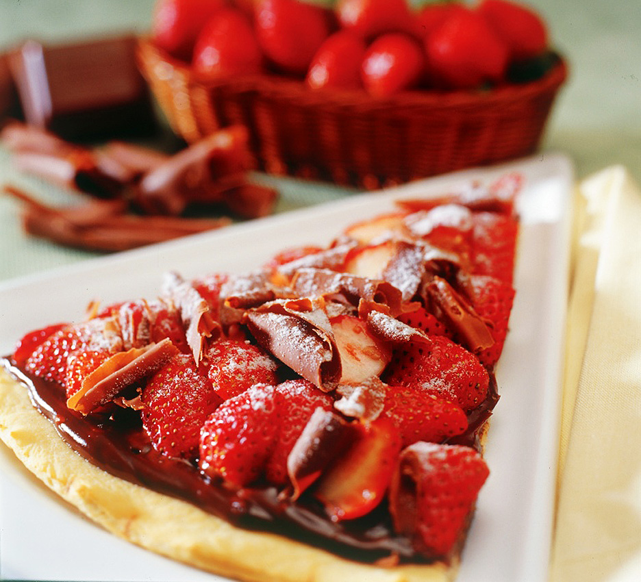 Derreta o chocolate em banho-maria, junte o creme de leite e misture até formar um creme. Espalhe metade do creme em cada disco de pizza e leve ao forno por cerca de cinco minutos. Retire e distribua os morangos entre os discos. Decore com raspas de chocolate e açúcar de confeiteiro.