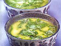Elimine os talos da couve, rasgue as folhas com as mãos, disponha numa panela com água fervente e 1 colher (chá) de sal. Deixe por 30 segundos. Retire do fogo, escorra a água e reserve. Coloque numa panela o fubá, leve ao fogo e torre, sem parar de mexer. Retire do fogo, despeje numa tigela e misture 100 ml de água fria. Leve ao fogo uma panela com o caldo de carne até ferver. Junte o fubá dissolvido e os ovos e mexa para desmanchá-los. Continue a cozinhar, mexendo de vez em quando, até encorpar e o fubá ficar cozido. Incorpore a couve, tempere com sal e retire do fogo. Sirva quente.