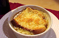 Toste levemente as fatias de pão italiano e esfregue-as com o dente de alho. Distribua a sopa em cumbucas ou refratários individuais, coloque uma fatia de pão sobre cada porção e salpique com o queijo parmesão e o gruyere ralados. Leve ao forno para que os queijos gratinem, sirva imediatamente.